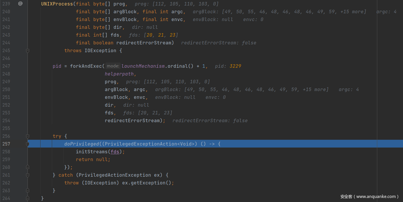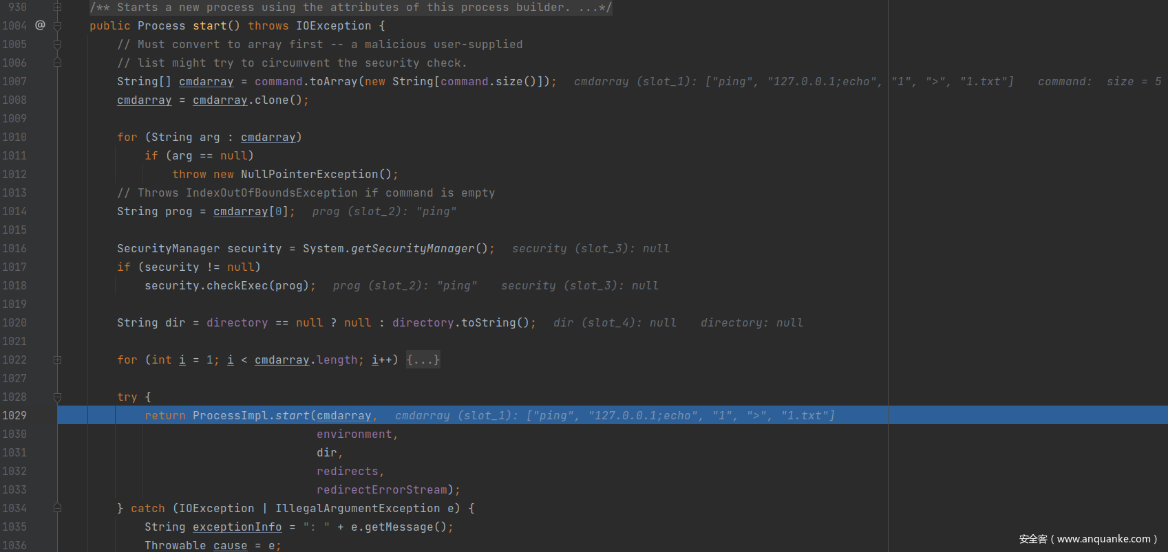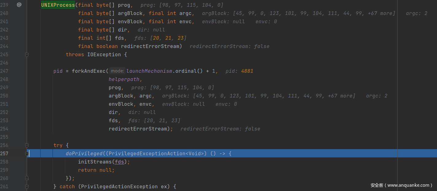 经过处理之后,最后实例化了 ProcessBuilder 来处理传入的 cmdarray。可以证实 Runtime.getRuntime.exec() 的底层实际上也是 ProcessBuilder。