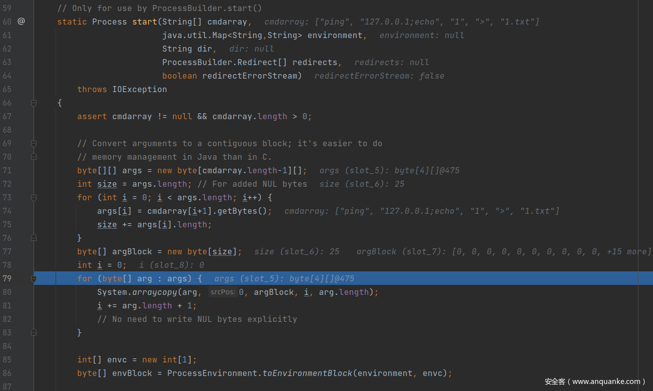 在 ProcessImpl.start 中 将 cmdarry 第一个参数 (cmdarry[0]) 当作要执行的命令,把后面的部分 (cmdarry[1:]) 作为命令执行的参数转换成 byte 数组 argBlock。