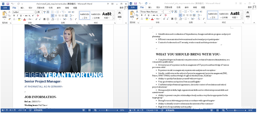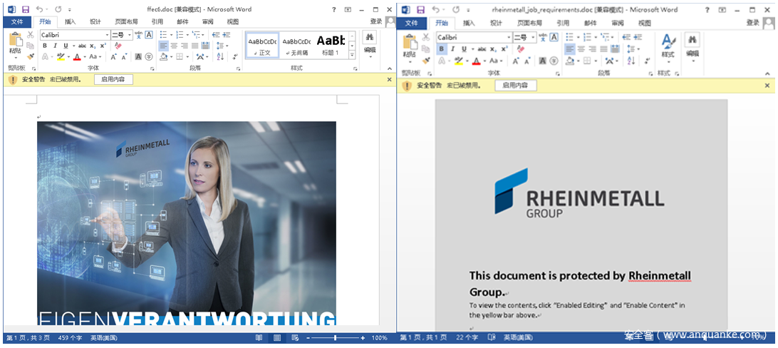 诱饵文档以德国军工企业“莱茵金属”工作要求为主题,诱导用户启用宏。