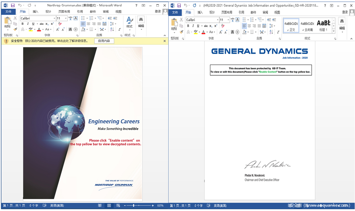在去年4月份,该组织曾以美国军工企业“诺思罗普·格鲁曼”(Northrop Grumman)和“通用电气”相关工作岗位信息作为诱饵针对军工企业进行攻击。