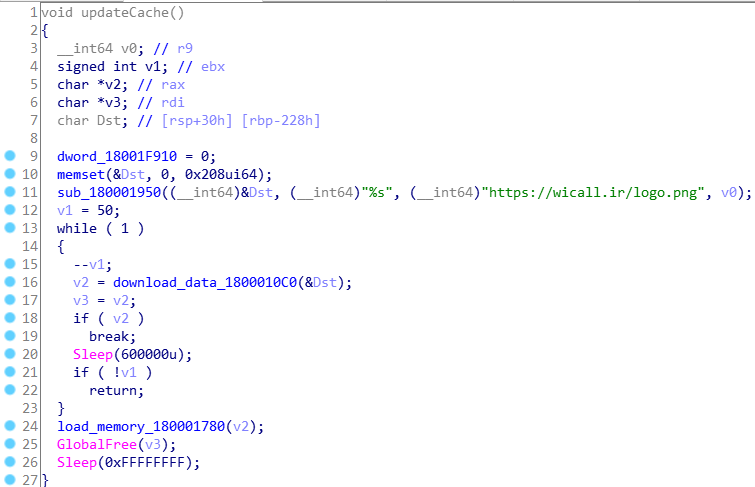 在导出函数updateCache中,每隔10分钟从服务器https://wicall.ir/logo.png请求下载分发其他恶意模块数据。