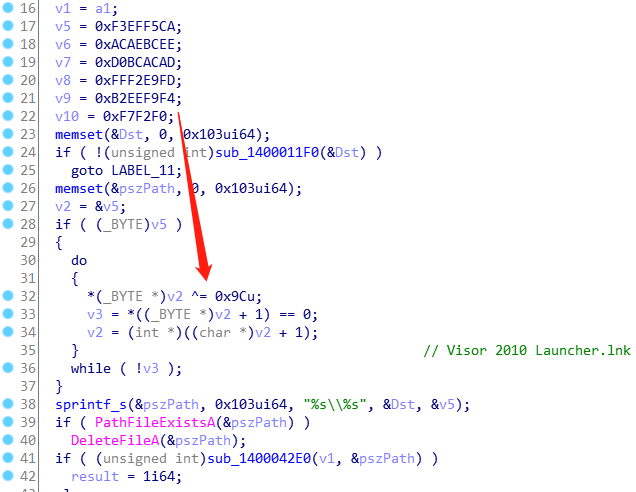 接着异或解密出lnk文件名“Visor 2010 Launcher.lnk ”,在主机开机启动目录生成lnk文件运行木马模块,以建立持久性机制。