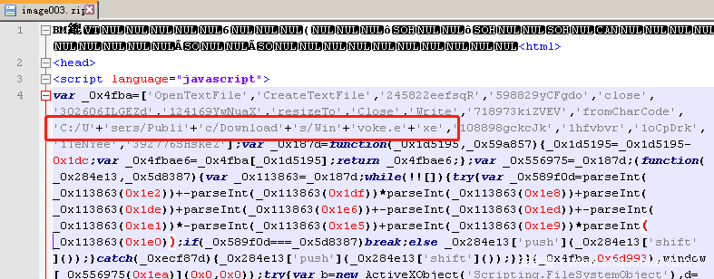 在image003.zip中,嵌入了经过混淆的javascript脚本代码,执行后解码出恶意模块数据保存到主机目录执行C:/Users/Public/Downloads/Winvoke.exe并运行。