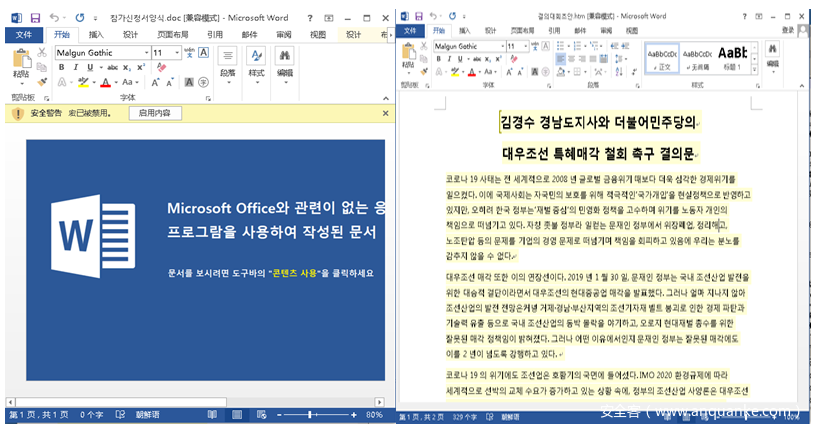 攻击者以“大会决议草案”为主题作为诱饵文档进行攻击,诱导用户启用宏,文档内容大意是反对韩国政府出售“大宇造船厂”的相关内容。