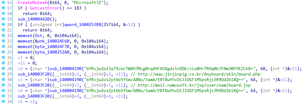 RAT模块执行后,首先创建互斥体“Microsoft32”,确保木马不会重复运行,之后解密出3组配置C2服务器,其中2个C2服务器配置是相同的。