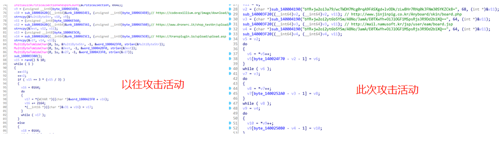 攻击者在此次攻击活动中使用的RAT模块与多起以往攻击活动中的样本具有关联性,例如Lazarus经常在RAT模块中配置3组C2服务器(即使重复),使用特定算法解密。