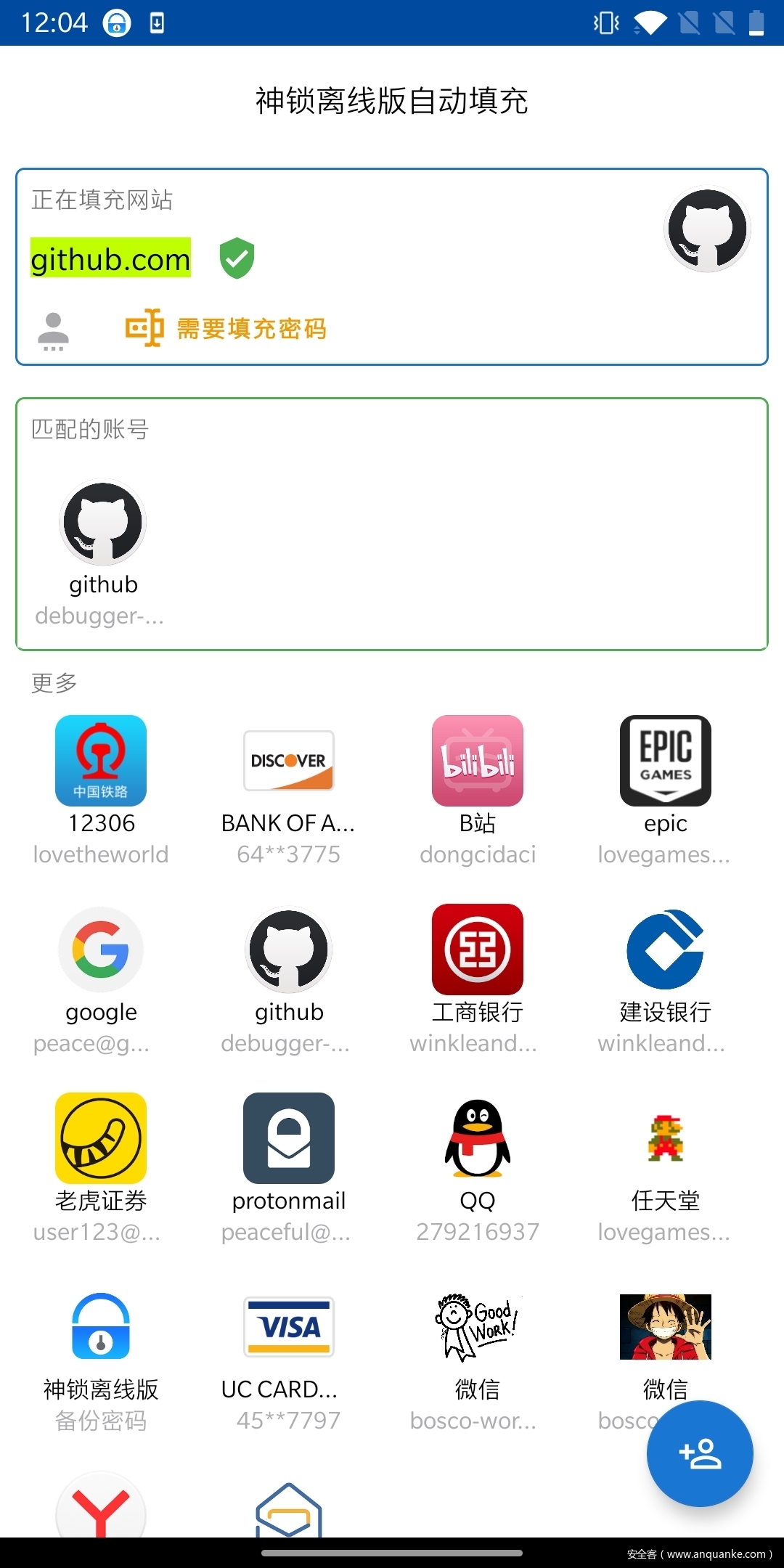 2. 用户使用神锁离线版App扫描电脑端页面二维码后,App会让用户选择要填充的账号。