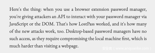 浏览器的插件开发接口基于Web技术,非常开放灵活,恶意程序通过DOM/JS,几乎可以访问页面中的任何数据。著名安全研究员 Sean Cassidy 在他的博客Browser Extension Password Managers Should Not Be Used中认为插件密码管理器风险无法避免。