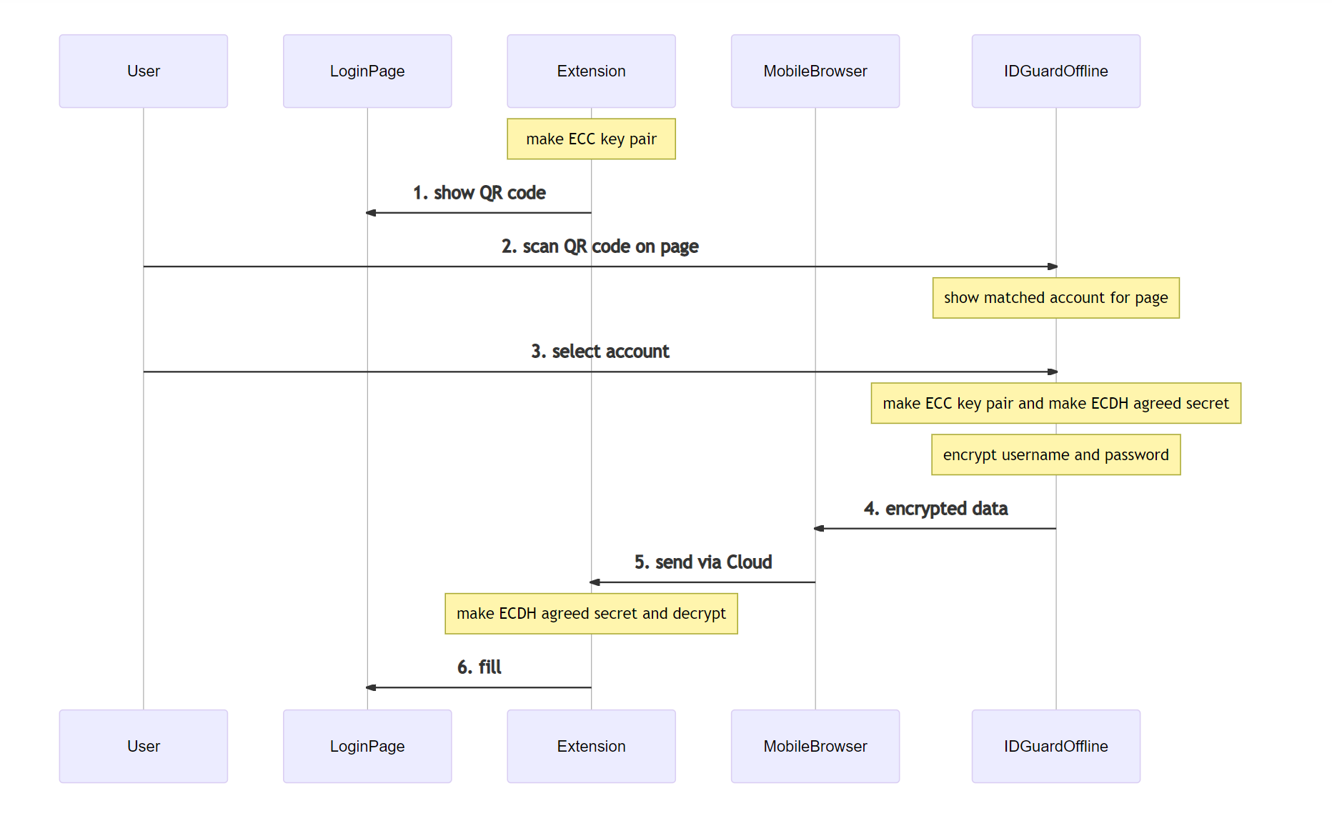 1. 插件检测到页面登录框后,生成椭圆曲线密钥对 (ECC 密钥对,elliptic-curve public–private key pair) ,将公钥和网址等信息编码成二维码,展示在电脑端页面上。