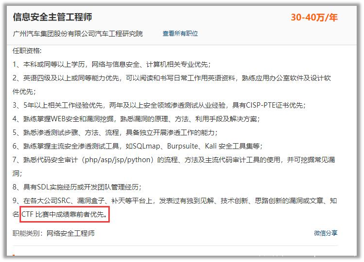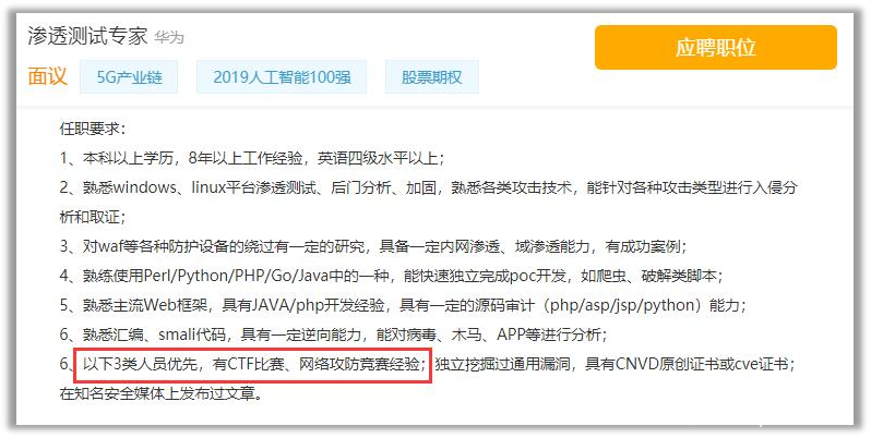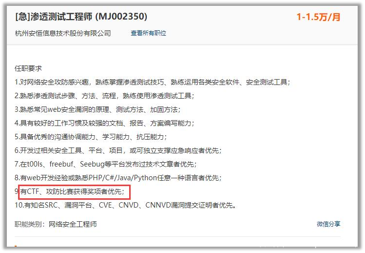 目前,相关企业招聘普遍看重CTF大赛获奖经历,安全名企大厂也经常会通过组织CTF竞赛发现人才,收揽人才。