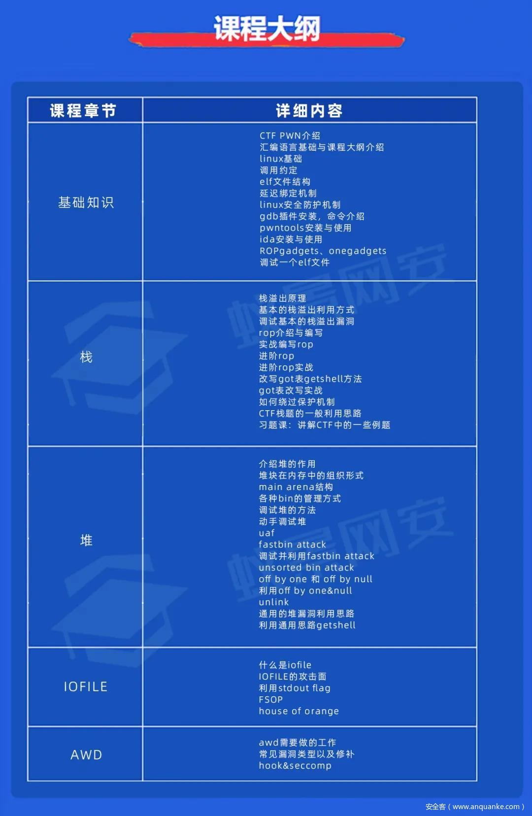 课程涵盖CTF PWN技能基础,包括汇编语言、ELF文件格式、LINUX延迟绑定机制、函数调用流程、栈溢出原理以及利用、ROP编写、LINUX动态内存管理机制、堆漏洞分析与利用、iofile利用手法、线下赛AWD模式的patch技巧等。