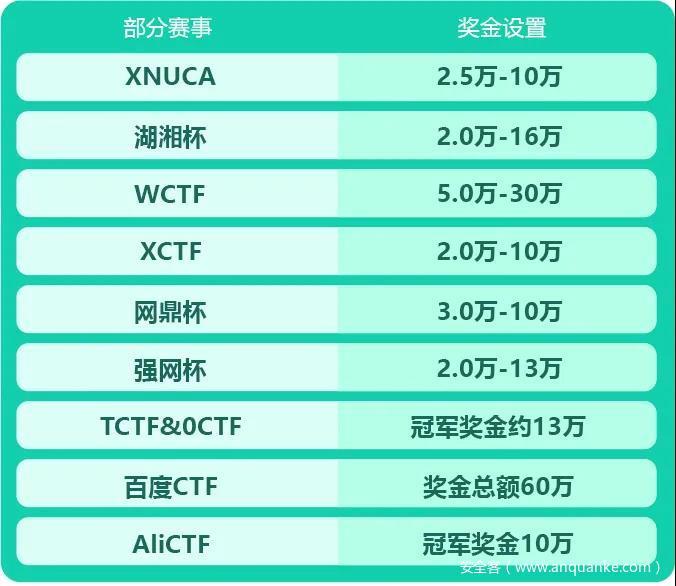 CTF赛事的奖金很可观。打CTF比赛不仅能挣钱,还能充分展示自己的技术水平,树立个人在网安业界的影响力。