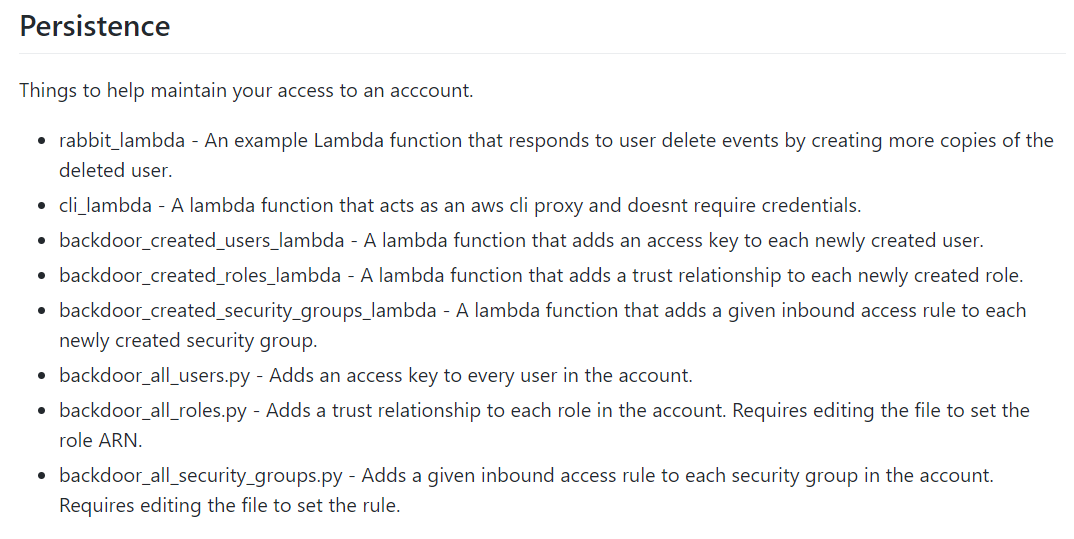 aws_pwn提供了多项技术以供攻击者可以完成针对aw的持久化攻击,关于aws_pwn所提供的持久化功能可见下图: