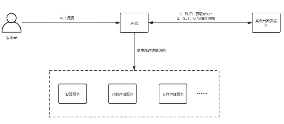 设想一下:当攻击者通过其他漏洞(例如RCE漏洞)获取实例的控制权之后,IMDSv2的安全机制将变得形同虚设。攻击者可以在实例上发送PUT请求获取token,随后利用获得的token获取角色临时凭据,最后利用角色临时凭据访问角色绑定的一切云业务,具体流程见下图:
