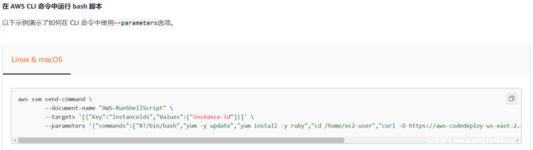 在配置好密钥后,攻击者可以尝试使用如下图命令通过AWSCLI在实例中运行bash脚本以获取实例控制权限。