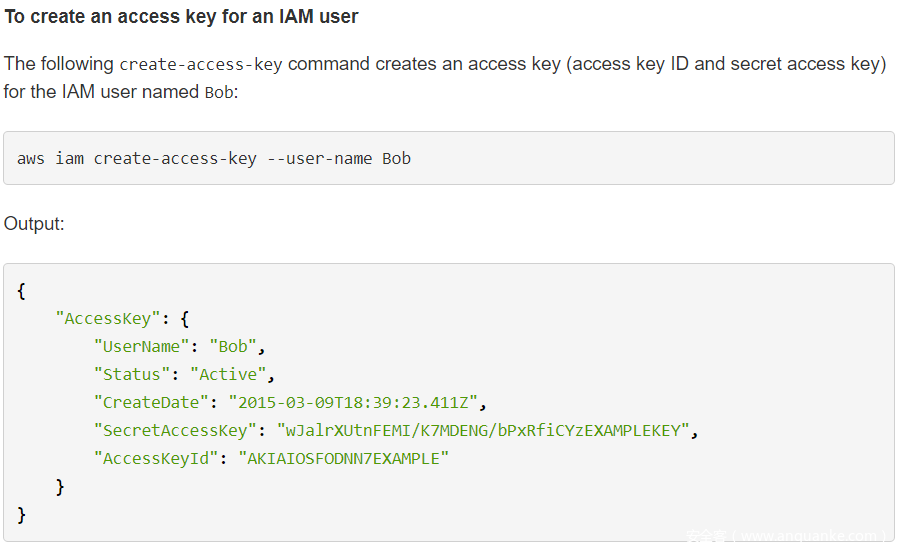 随后使用awsiam create-access-key –user-name Bob指令为Bob用户创建凭据