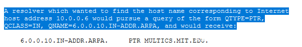 想要查找与Internet主机地址10.0.0.6相对应的主机名的解析器将执行以下形式的查询:QTYPE = PTR,QCLASS = IN,QNAME = 6.0.0.10.IN-ADDR.ARPA,并将收到: