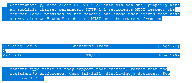 - 在最初显示文档支持的时候,必须使用发送者的content-type设置的字符集