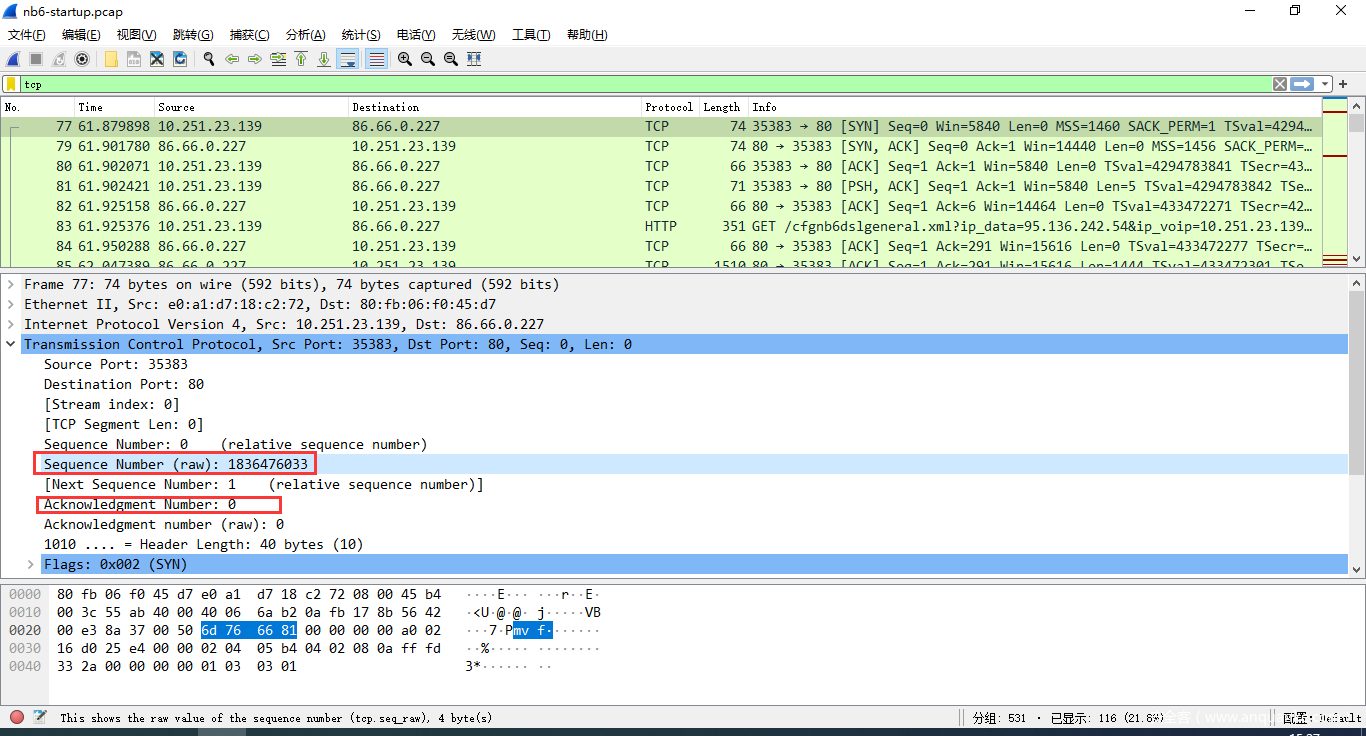- 如果未出现raw原始序列号,则把钩选上再看。对于TCP主要观察序列号和确认号