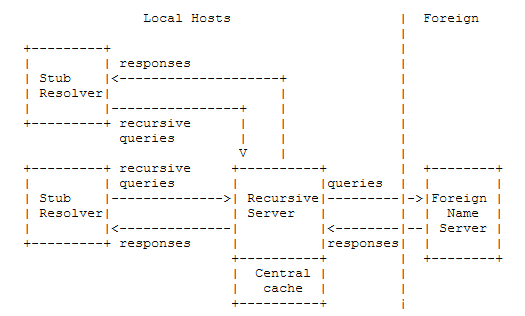 还可以定制信息流,以便一组主机一起行动以优化活动。 有时这样做是为了卸载能力较弱的主机,这样它们就不必实现完整的解析器。 这对于希望最大程度地减少所需新网络代码量的PC或主机而言是合适的。 在集中式缓存具有较高命中率的前提下,该方案还可以允许一组主机共享少量缓存,而不必维护大量单独的缓存。 无论哪种情况,解析器都将由存根解析器代替,存根解析器充当位于一个或多个已知执行该服务的名称服务器中的递归服务器中的解析器的前端: