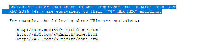 - 除了“保留”与“不安全”的字符集之外(RFC2396),其他字符等价于百分号编码。以下三个URL是等效的