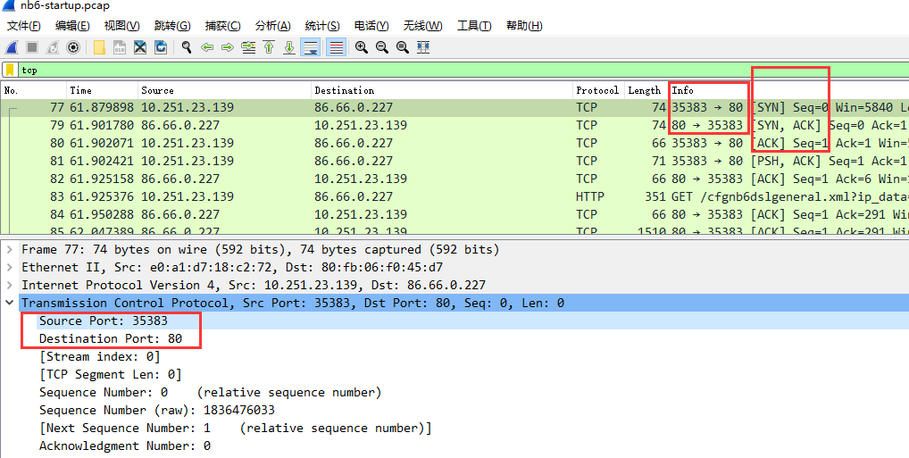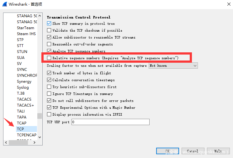 - 编辑>首选项>协议> TCP>去掉相对序列号的钩来查看原始序列号。