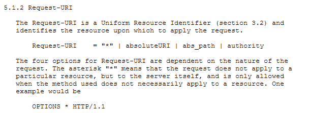 - 星号“*”表示请求不适用于特定资源,而是适用于服务器本身,也就是有的方法不是请求资源的,则使用星号来作用于服务器。