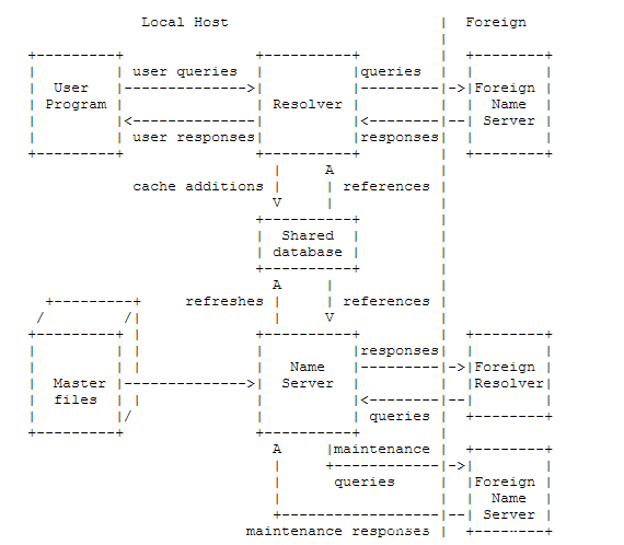 共享数据库保存本地名称服务器和解析器的域空间数据。 共享数据库的内容通常是由NameServer的定期刷新操作维护的权威数据和来自先前解析程序请求的缓存数据的混合。 域数据的结构以及NameServer和解析程序之间同步的必要性暗示了此数据库的一般特征,但实际格式取决于本地实现者。