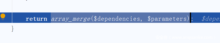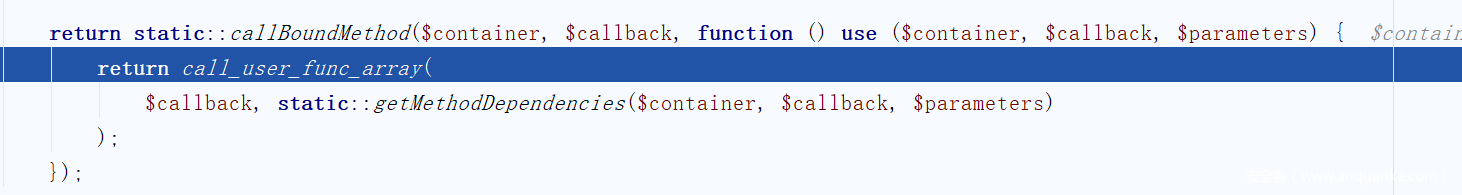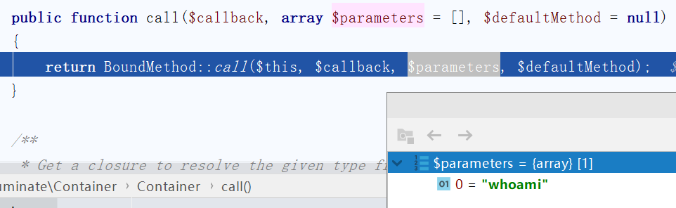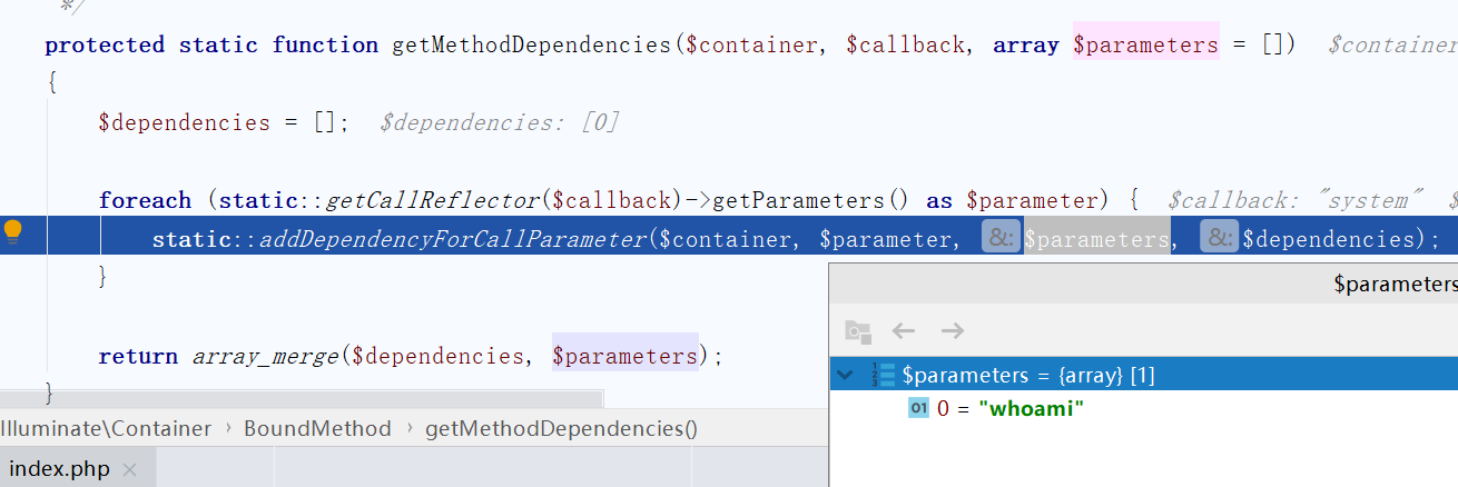 函数的最后将我们传入的$parameters数字和$dependencies数组(为空)合并之后return,最后在BoundMethod对象的call()中我们相当于执行了call_user_func_array(‘system’,array(‘whoami’))