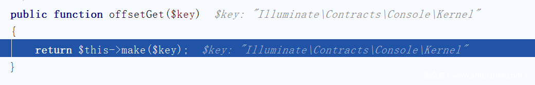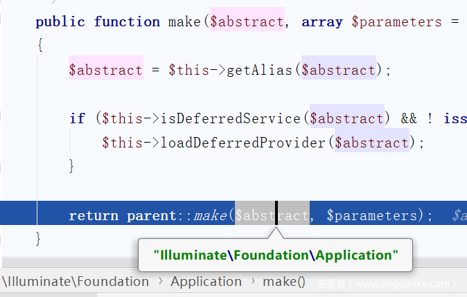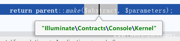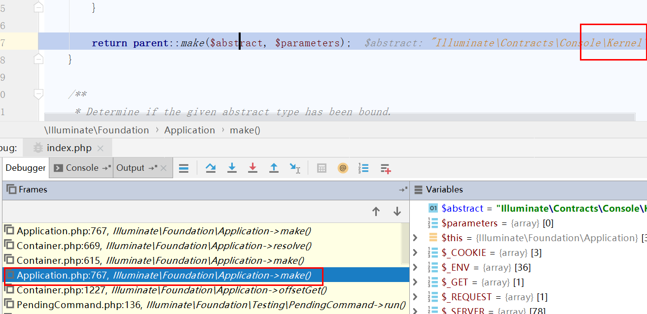 对比上次进入Container::make时,$abstract的值为Kernel,现在已经是Application了,