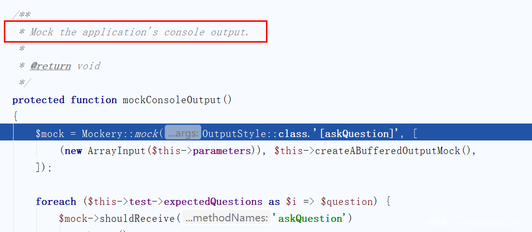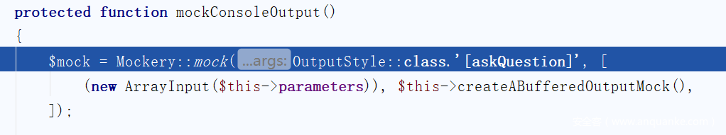 call($this->command, $this->parameters)处疑似run()内的命令执行点,在到达call()之前还有一个$this->mockConsoleOutput()方法,要想达到疑似的命令执行点,需要顺利走过mockConsoleOutput(),根据注释,改函数的功能是”Mock the application’s console output.”,就是模仿应用的控制台输出,