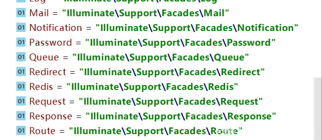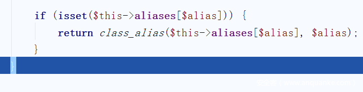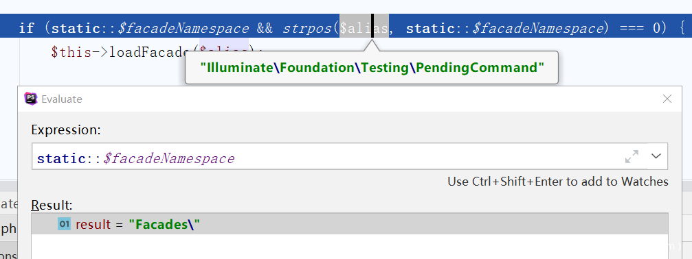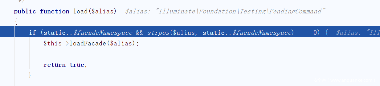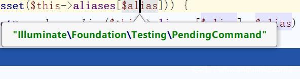 可以看到,这里首先加载的是PendingCommand对象,对于它来说,其名字里不含有Facade,故而进入下面的流程,判断$this->aliases中是否有$alias,