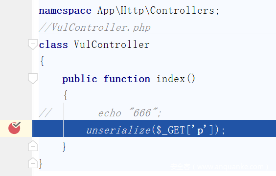 配置过程如下,在routes/web.php中添加一条路由记录,Route::get('/vul', 'VulController@index');,然后在app/Http/Controllers目录下新建文件VulController.php,源码如下: