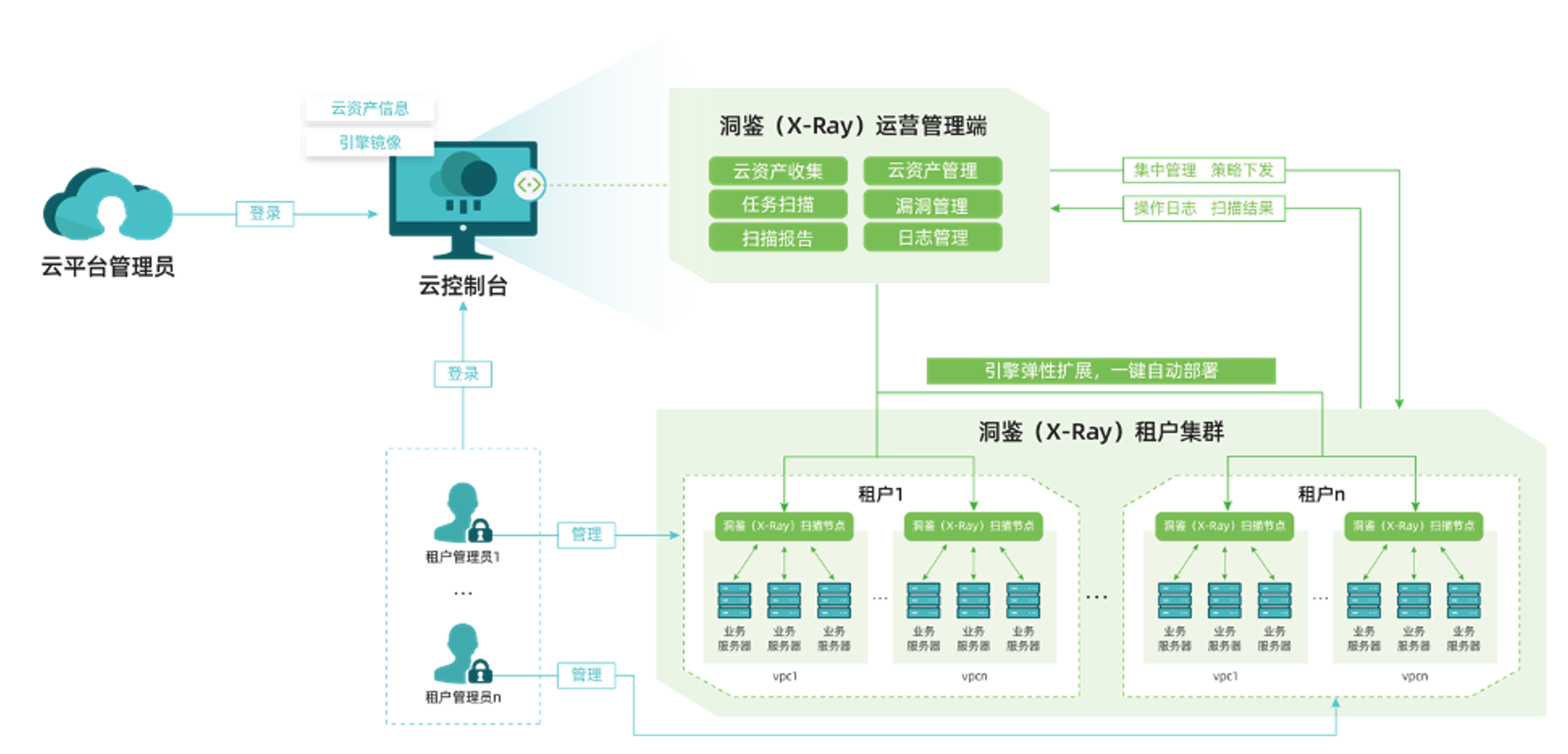 本方案采用洞鉴(X-Ray)安全评估系统的轻量化分布式部署模式,深度适配云架构、融入云管平台,在云平台使用一个管理端,对所有扫描节点进行统一管理,规避了需要在VPC内部署完整扫描器的弊端。方案支持租户侧一键式自动部署启动,在严格的云租户数据权限隔离基础上,自动完成网络环境检查、资源配额,实现租户侧扫描节点的灵活扩展和统一管控。