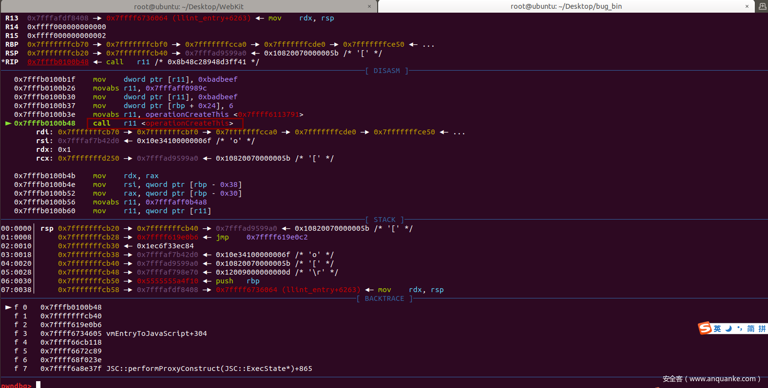 然后在js代码中调用print,即可断下。如果我们要打印信息,利用debug函数来打印,因为print已经被我们拿去断点用了。另一种方法是我们自己在Source/JavaScriptCore/jsc.cpp源码中增加一个dbg函数,并在函数中实现int3指令,然后就能在js中调用。