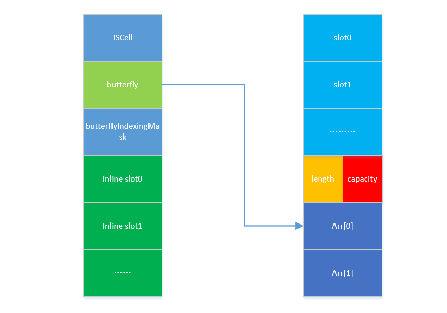 可以看到,butterfly里存储着数组的元素,而其他属性则仍然存储于对象中,我们称这些为内联属性,因为其存储于对象内部。现在测试代码再修改一下
