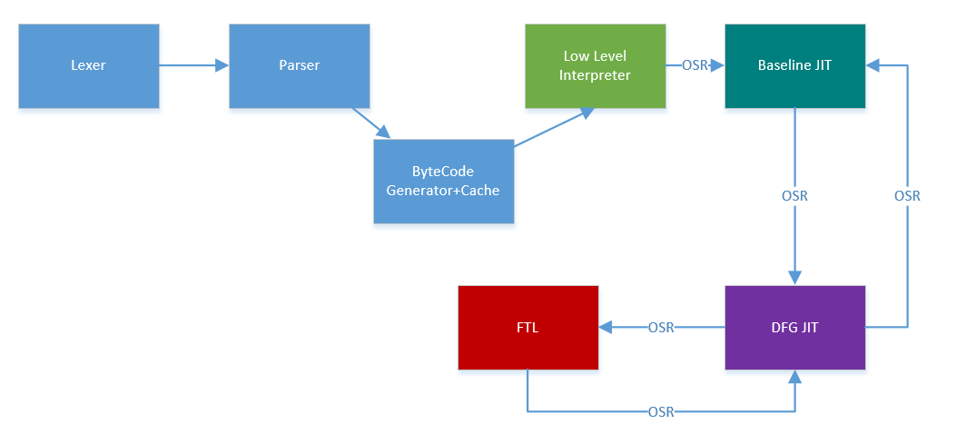 可以知道,Baseline JIT->DFG JIT->FTL每一个过程都进行了更加深入的优化,优化一般就是通过类型收集和判断,消除一些不必要的类型检查,并生成机器码,从而可以节省运行时间。由于js是动态类型语言,当类型优化推断错误时,便可以返回上一级,比如DFG JIT优化错误,则返回Baseline JIT运行同时重新进行类型收集以便下一次优化。这个执行过程的转移使用的方法是堆栈替换 on-stack replacement,简称 OSR。这个技术可以将执行转移到任何 statement 的地方。