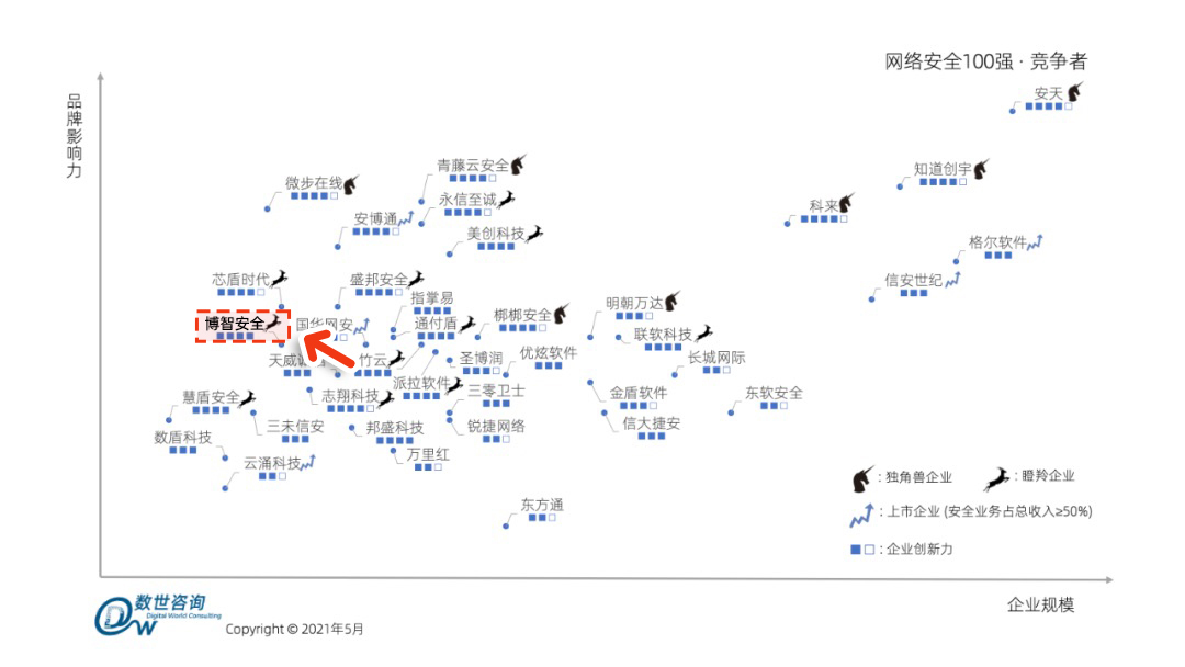 本次入选数世咨询的《中国网络安全百强报告(2021)》,是对博智安全的持续经营能力、技术创新能力、品牌及市场影响力的全面认可。博智安全将以创新为驱动,以更强的技术实力及服务能力,为更多行业客户的网络安全保驾护航。