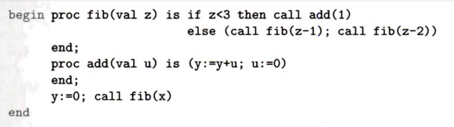 可以将fib理解为函数,传入的变量是z,u输出的变量是v。call调用fib,传入x,0。进入if-else,如果z<3输出y=0+1,否则调用fib并且分别传入z-1,u和z-2,v进行递归算法