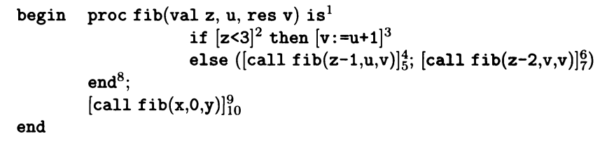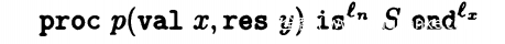 对于变量声明语句,我们记录变量名,以及变量对应的作用域。我们用proc p(val x,res y) is^l_n S end^l_x 来表示。其中x表示调用变量,y表示结果变量,is表示开端,end表示结尾,l_n,l_x分别表示开端结尾语句的标签。