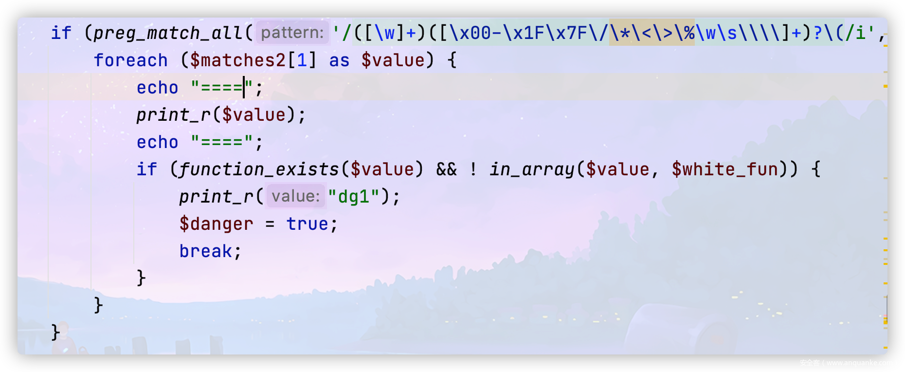 测试之后会发现并不能执行,因为无法绕过第二条正则,我们可以通过简单的输出来打印下程序在进行安全校验的情况