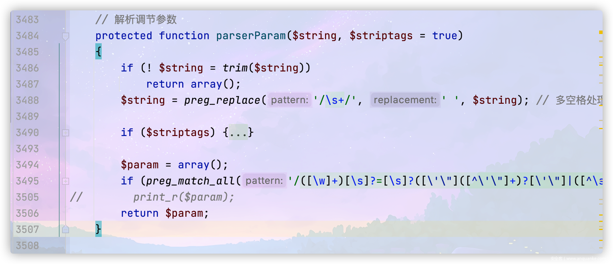 sql语句不允许对ay_user与ay_member两个表进行操作,但是不影响我们写标签到数据库;接着看该段代码,其中的重点在$this->parserParam($matches[1][$i]);,跟进该方法