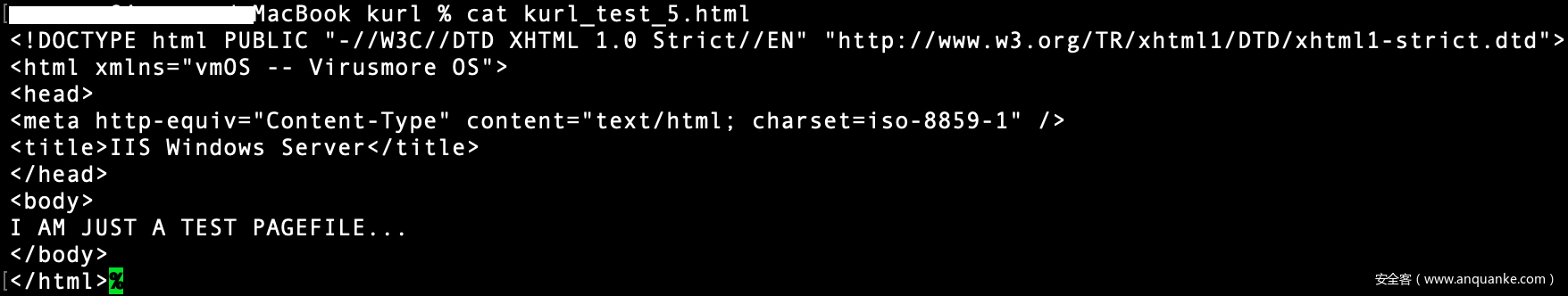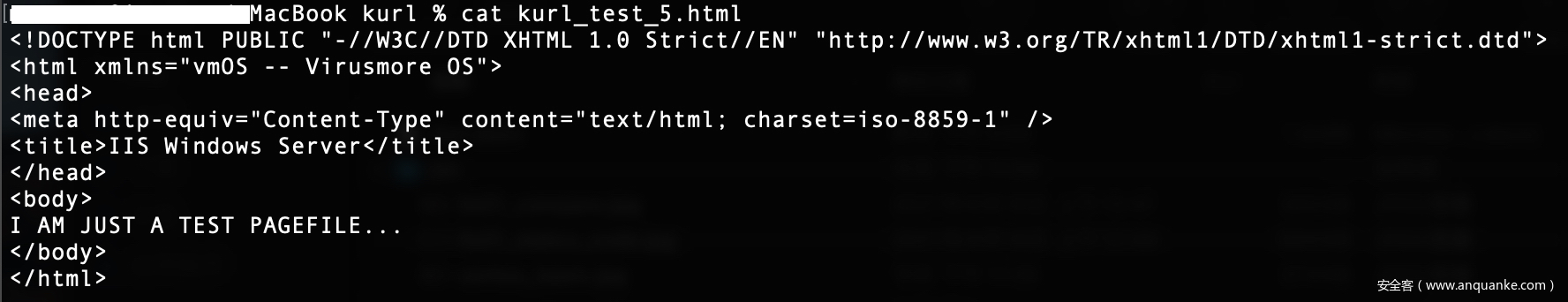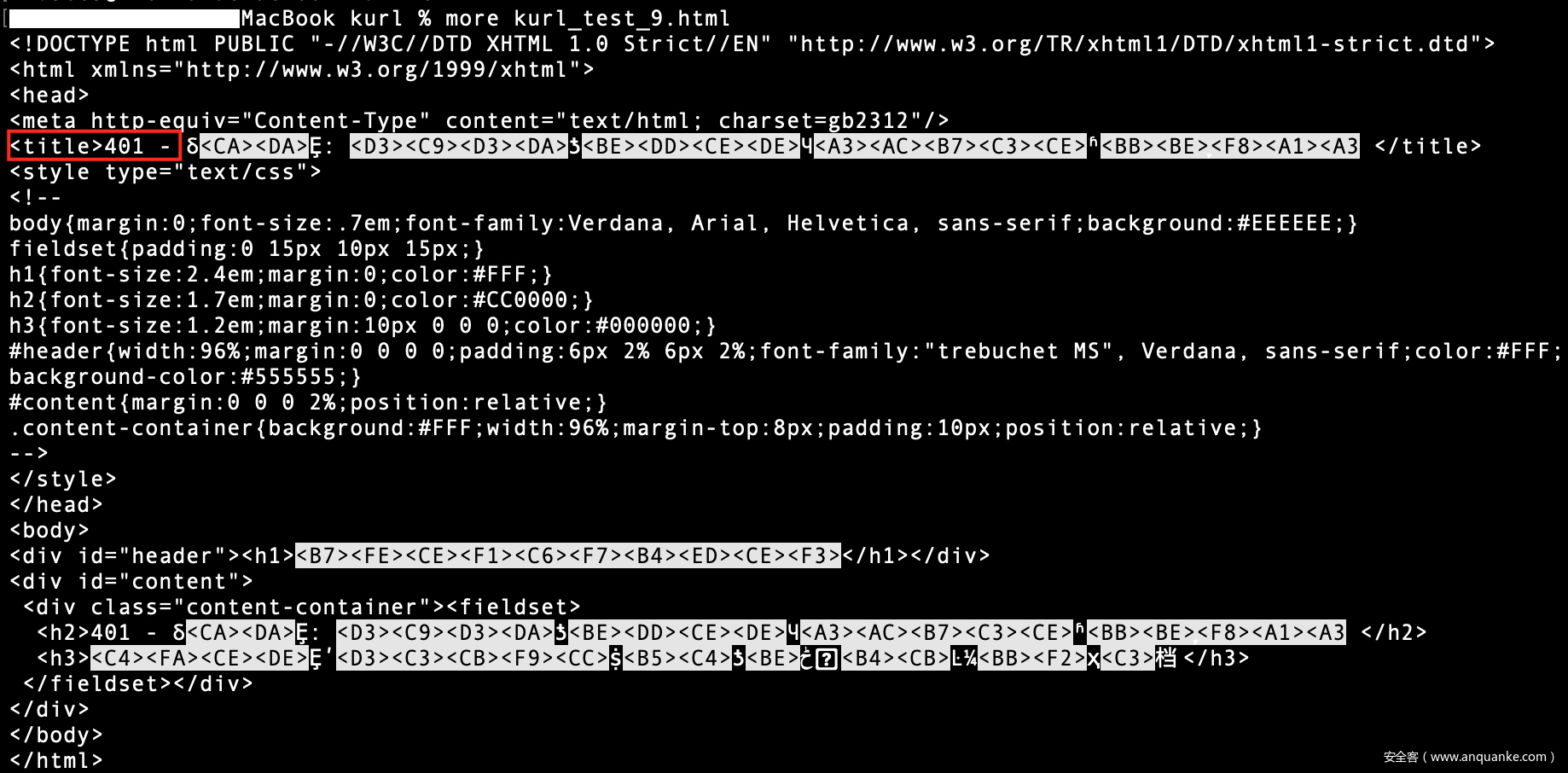 在Windows Srv 2012 R2服务器上,IIS用户验证设置为basic时,kurl会逐一用“test:密码”这样的验证信息调用curl命令,并且保存读取到的文件。从ls罗列出的信息来看,kurl_test_5.html的文件的大小明显小于其它html文件。通过查看该页面内容,的确为所需访问的目标页面,如下: