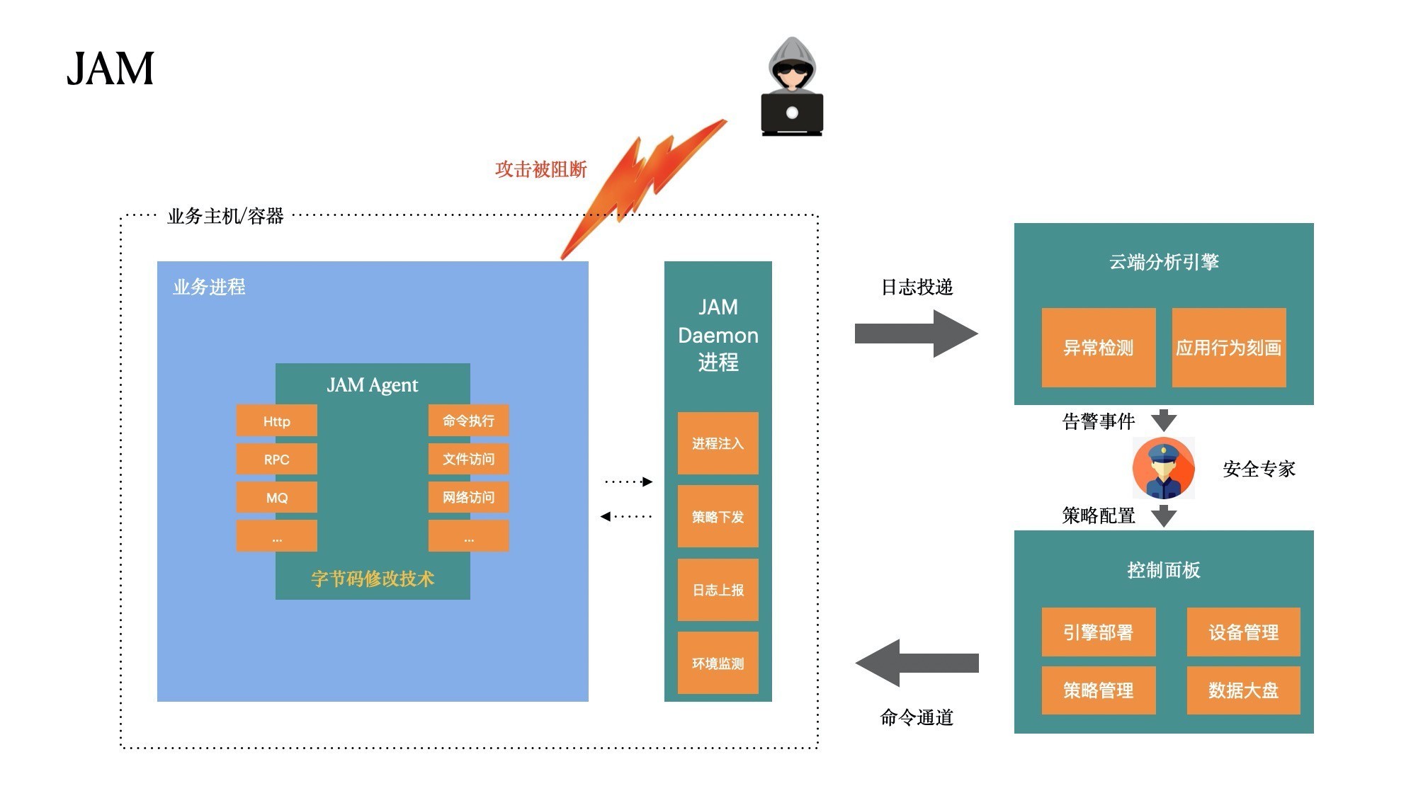在2015年底, 阿里安全就已完成了JAM的初版Demo,2016年产品化完成落地日常全量部署。历经多次技术方案迭代,当前的架构如下: