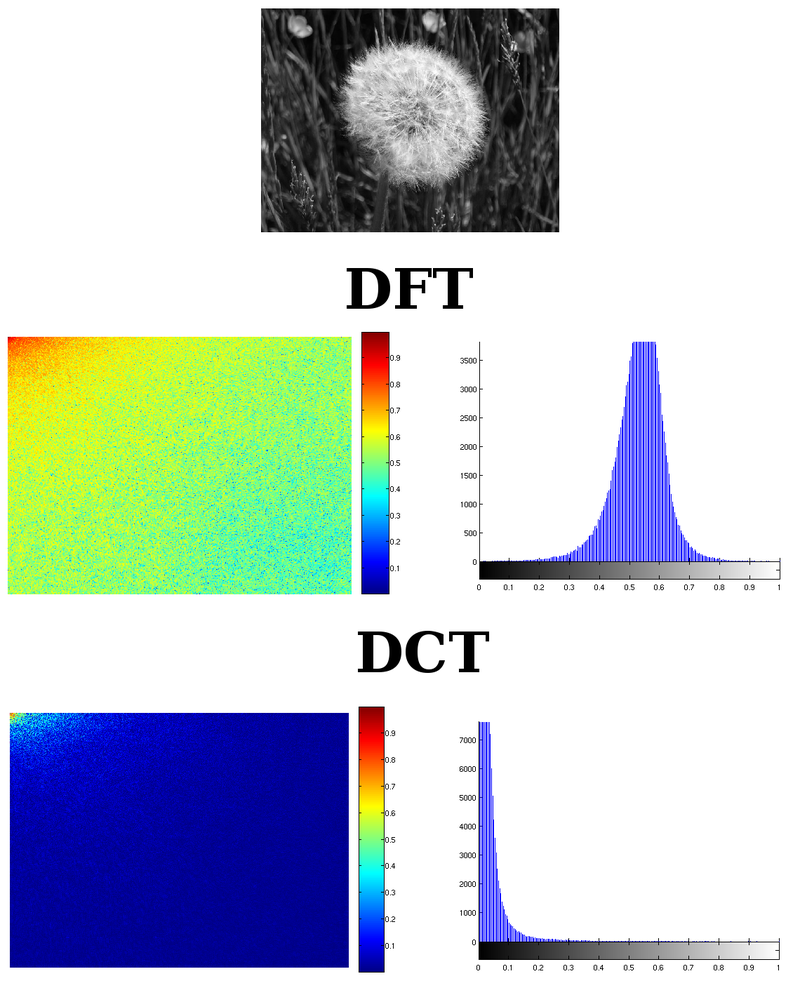DCT 离散余弦变换属于一种特殊的 DFT 离散傅里叶变换,在暗水印领域有非常相似的使用手法。所以这里仅对基于 DCT 变换的水印进行展开。下图为对“蒲公英”灰度图做 DFT 和 DCT 变换后的频谱分布,可见峰值分布是不同的。