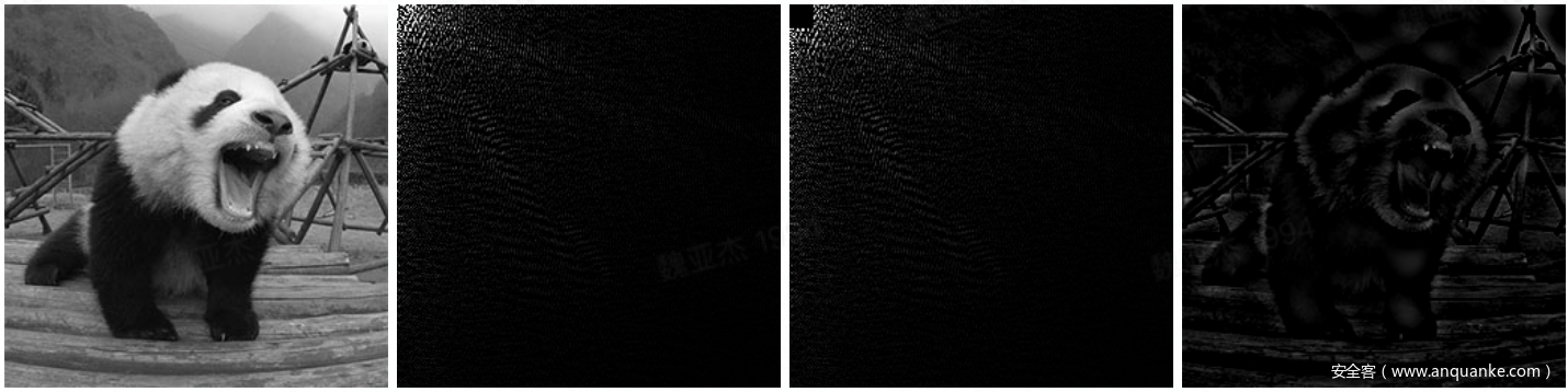 下面四幅图分别是 原图 >> DCT 变换后的频域的灰度图 >> 将频域左上角数据清零 >> 再次转换成空域的图片。