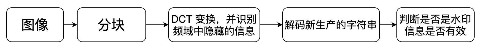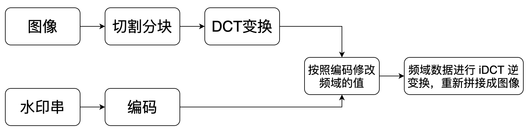 隐藏水印嵌入过程大概如下,框架相对简单。在实际应用中会根据不同的场景选择不同的分块和不同的频域区域,这些需要经过大量的实验和理论的沉淀才可以做出选择。