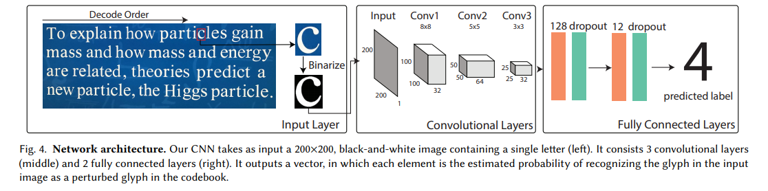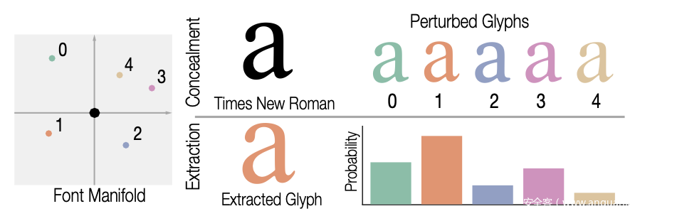 在 FontCode一文中,作者根据水印信息对英文字符的几何特征进行一些微小的扰动生成水印字符。在嵌入端,字符扰动的方法是基于字符结构实现的,而提取端是通过对扰动模式的识别进行水印信息恢复。