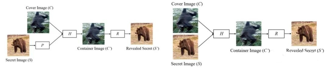 右图中的框架和左图类似,差别在于S不需要进行预处理。若秘密信息为二进制字符串,通常将其重复多次以达到和C相同的大小,或将其reshape成C的形状后再upscale到C的大小,然后将其与C拼接输入到H中完成信息嵌入。