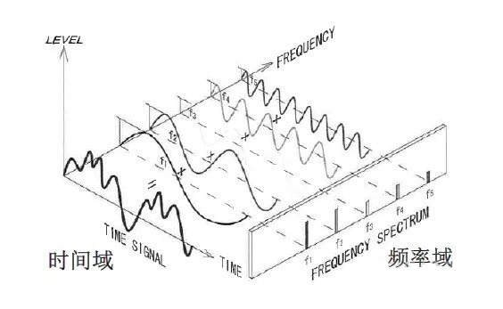 下图可以通俗理解频域变换的逻辑。左下角“时间域”(可以粗略理解为空域)的一维波形,可以由右上角 f1 f2 f3 f4…等多个规则波形叠加而成,而这些波形都对应一个固定频率,那么将他们投影到右下角的“频率域”中,形成另一幅坐标图。这个过程就可以简单理解为傅里叶变换的过程。
